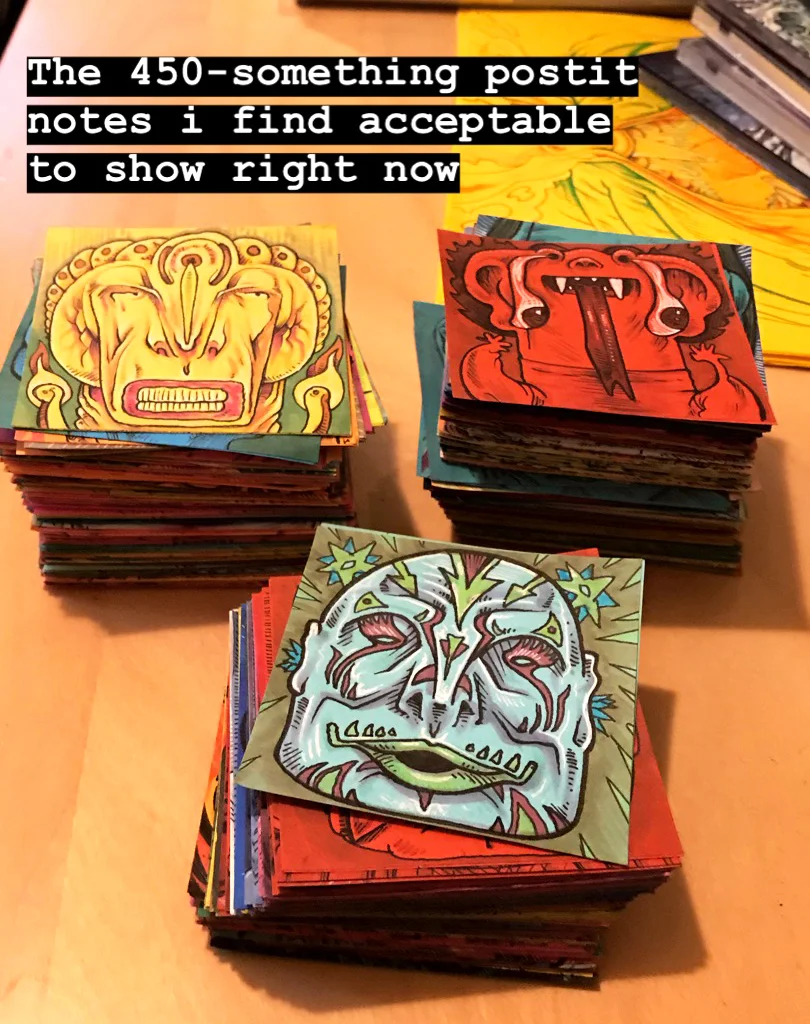 Ive drawn over 1,050 faces on postit notes of different shapes and sizes over several years. I’ve shown them in the annual Post It show at Giant Robot for a few years and showed over 450 of them in Highland Park in a show at the VapeGoat Gallery. Ive made zines from them and plan to continue showing them.